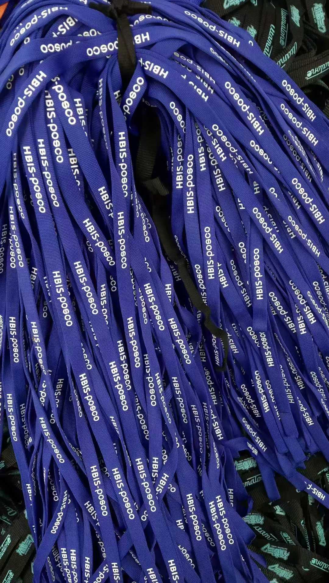 가장 먼저 눈에 띄는 딥 블루 컬러의 랜야드는 바로 HBIS-POSCO의 사원증 목걸이 줄입니다. 신뢰감을 주는 짙은 청색 바탕에 화이트 로고를 깔끔하게 전사 인쇄하여 기업의 아이덴티티를 확실하게 살렸습니다. 대규모 인원이 착용하는 만큼 튼튼한 내구성은 필수겠죠?
