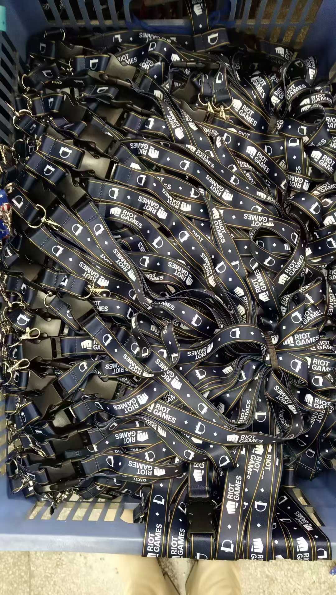 리그 오브 레전드(LoL), 발로란트 등으로 유명한 세계적인 게임 개발사 **라이엇 게임즈(Riot Games)**의 랜야드입니다. 블랙 베이스에 골드/화이트 톤의 로고 디자인이 들어가 있어 굉장히 고급스럽고 시크한 느낌을 줍니다. E-스포츠 행사나 사내 직원용으로 사용될 때 그 프리미엄 한 분위기가 돋보일 것 같습니다.